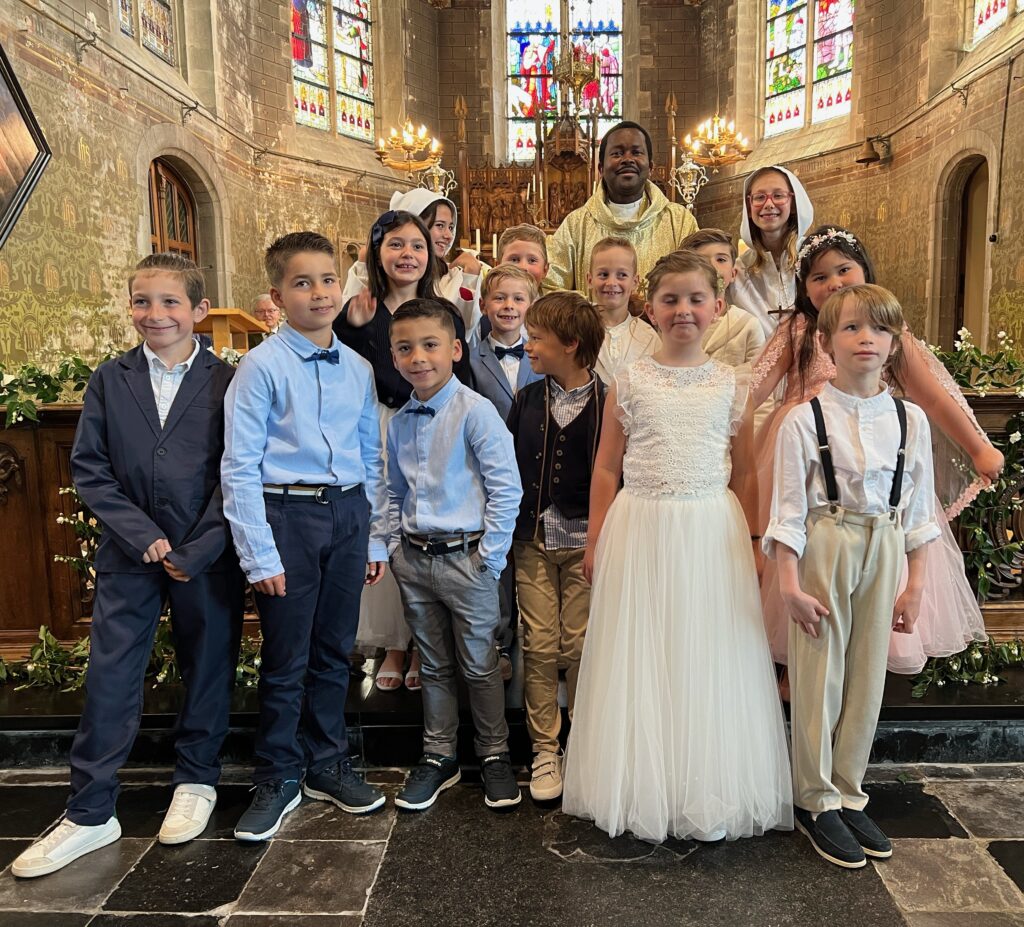 Pater Jude wacht hen op achteraan in de Sint-Ambrosiuskerk: de twaalf jongens en meisjes die op zondag 25 april voor het eerst de communie ontvangen. Wat zijn zij blij en een beetje nerveus! Samen met hen vieren de hele geloofsgemeenschap, hun ouders, broers en zussen, grootouders, peters, meters en catechisten mee. Na de intredeprocessie zingen zij het lied ‘Kinderen van de Vader’ en zo mag elk van hen zich voelen: een kind van God.