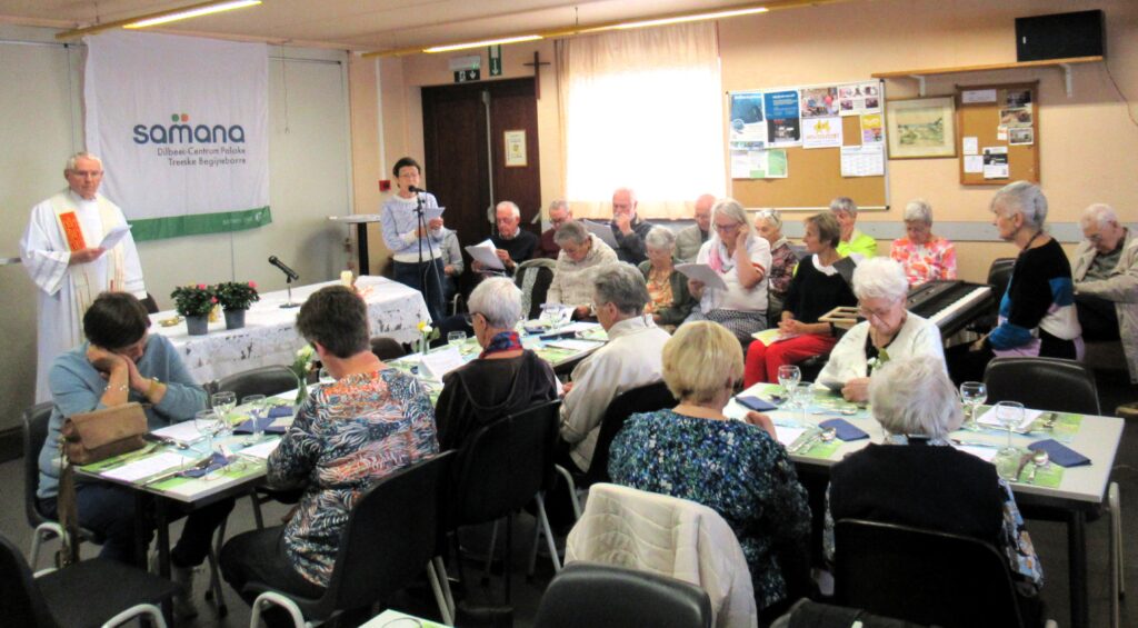 Op zondag 5 oktober kwamen we met Samana in het kader van de nationale ziekendag samen in het verloren Hofke. En omdat het 75 jaar geleden is dat de vereniging opgestart werd was het toepasselijke thema van de viering: ‘Zullen we samen’? Samana wil bouwen aan een warme samenleving waar iedereen meetelt en daarom klinkt deze vraag als een uitnodiging. Een uitnodiging om tijd te maken voor elkaar, om te luisteren en te verbinden. Kleine daden van nabijheid die een groot verschil kunnen maken. Deze intentie wou ook gerealiseerd worden in het samenzijn in de eucharistieviering en in de warme maaltijd achteraf. Ook de voorzitster Denise, die reeds 10 jaar de kar trekt, werd in deze warme boodschap opgenomen: ze werd onlangs 90 jaar. De vereniging is dankbaar om haar volgehouden inzet en Denise zelf is dankbaar om elke dag die haar weer geschonken wordt. Ze werd dan ook letterlijk in de bloemetjes gezet.