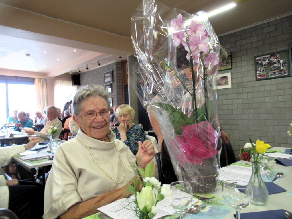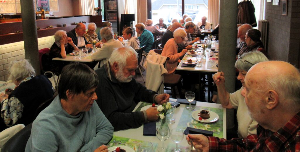 Na de viering was er dan eerst het aperitief aangeboden door de jarige Denise gevolgd door een overheerlijke feestmaaltijd met bloemkool- en pastinaaksoep, een zalmschotel en chocoladeparfait, dit alles vergezeld door een glaasje wijn of water of frisdrank. Na nog een laatste kopje koffie met een koekje kwam omstreeks 17 uur het afscheid. Er werd heel wat bijgepraat, sommige mensen vinden elkaar terug bij deze bijeenkomsten en zijn blij elkaar weer fysiek te kunnen ontmoeten. Afspraak in december voor het kerstfeest. Het is een mooie traditie die al zo veel jaar verder leeft!